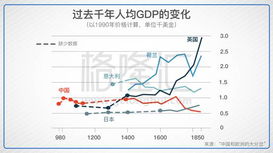 欧洲从13世纪到19世纪,人均GDP,意大利、西班牙、荷兰、英国依次登顶。其中意大利在公元1300年左右曾经是欧洲最富有的国家,人均收入大概1500美金(按1990年价格计算),已经超过了中国(中国当时约1000美元),但是意大利在15世纪就开始衰落了,后面几百年人均GDP越来越低,怪不得从《威尼斯商人》之后再也不大听说这个国家。从意大利、西班牙、荷兰到英国,分别依靠的是地中海贸易、远洋贸易和工业革命。今天我们只记得英国的繁荣和相对没落,其实在时光之河中,英国相比意大利、西班牙和荷兰,曾经那般落后。