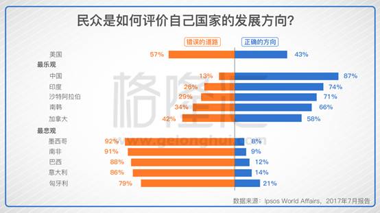 最认可自己国家发展方向的是谁?中国。高达87%的民众认为自己的国家走在正确的道路上: